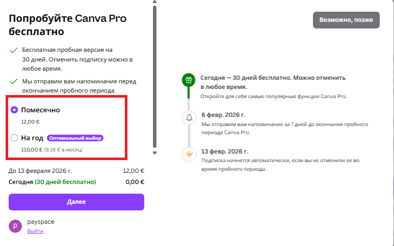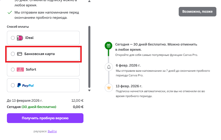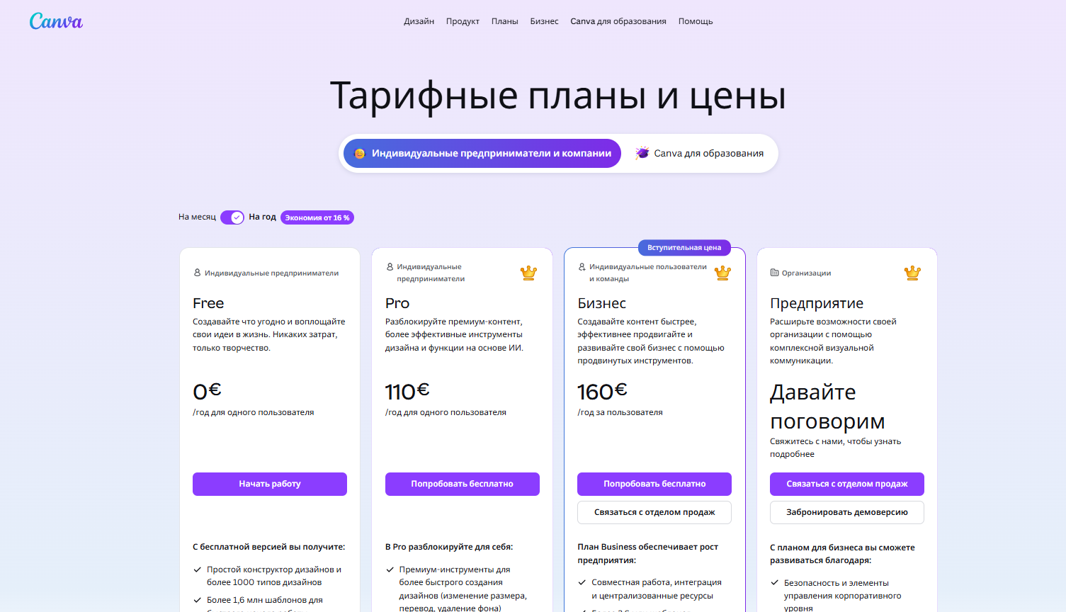 Переход на платный тариф Canva выполняется через меню аккаунта в разделе Тарифные планы и цены. Для оплаты можно использовать виртуальные карты Service Pay от PAY.SPACE.