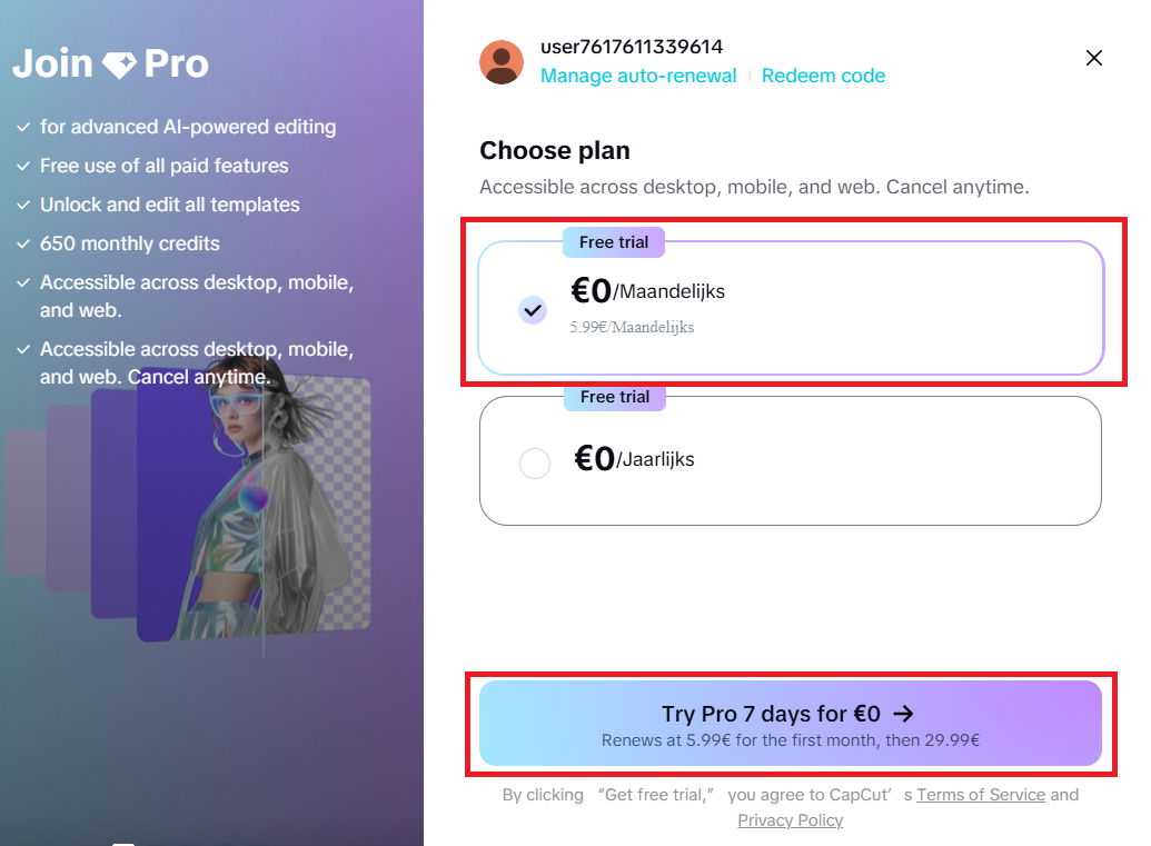 3. После нажатия откроется окно выбора подписки CapCut Pro