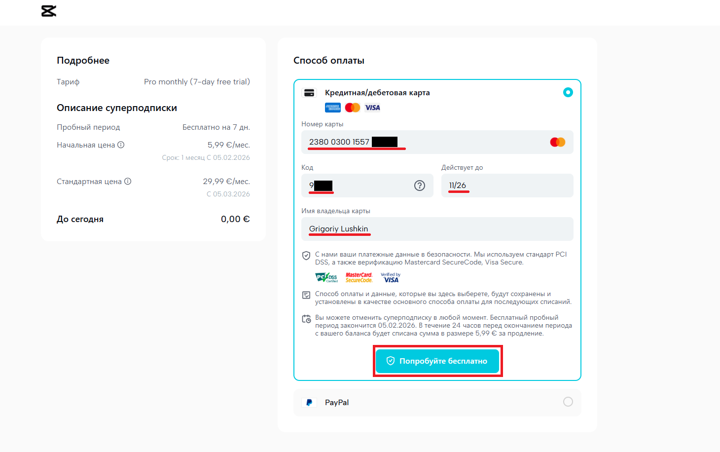 Если выбран пробный период, списание произойдет после его окончания. Подписка CapCut Pro активируется сразу после успешного подтверждения карты.