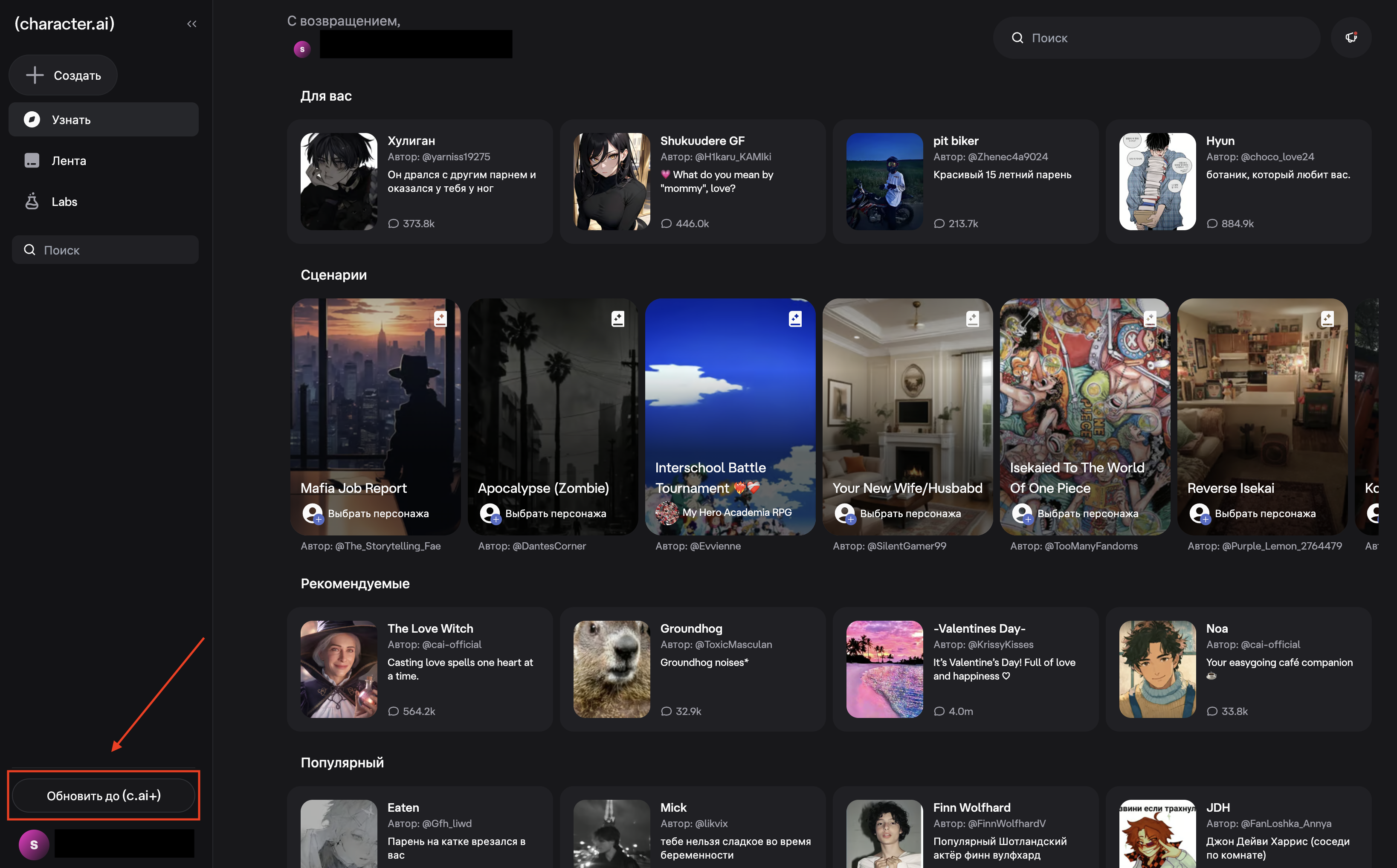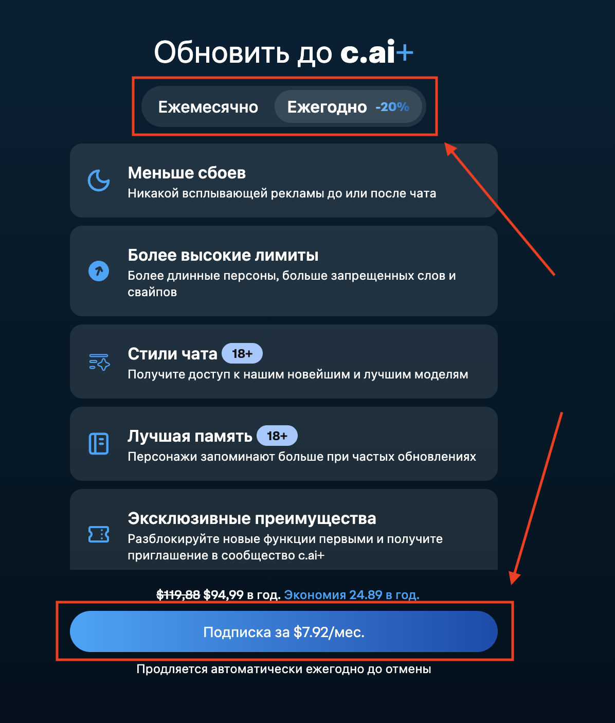 Зайдите в аккаунт Character.ai В левом нижнем углу нажмите кнопку «Обновить до c.ai+» На экране подписки выберите формат оплаты ежемесячно или ежегодно со скидкой Нажмите кнопку оформления подписки