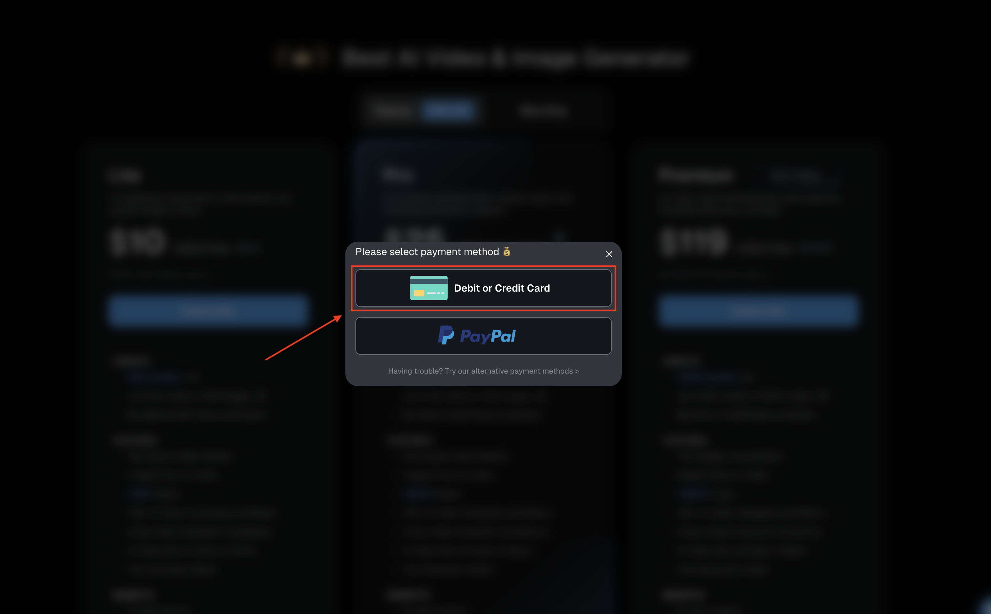 Откроется окно выбора метода оплаты. Выберите пункт Debit or Credit Card.
