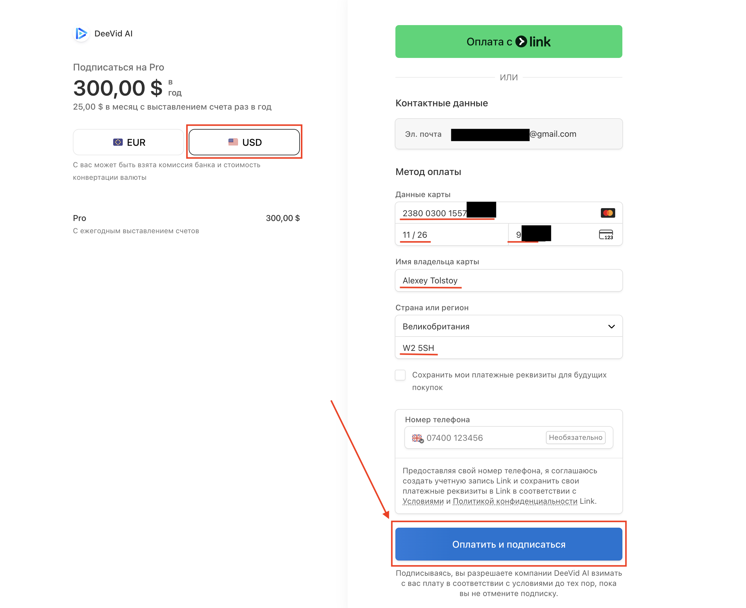 Оплата DeeVid.ai проходит как обычная международная транзакция. Сервис «видит» стандартную зарубежную карту и принимает платеж без ограничений.