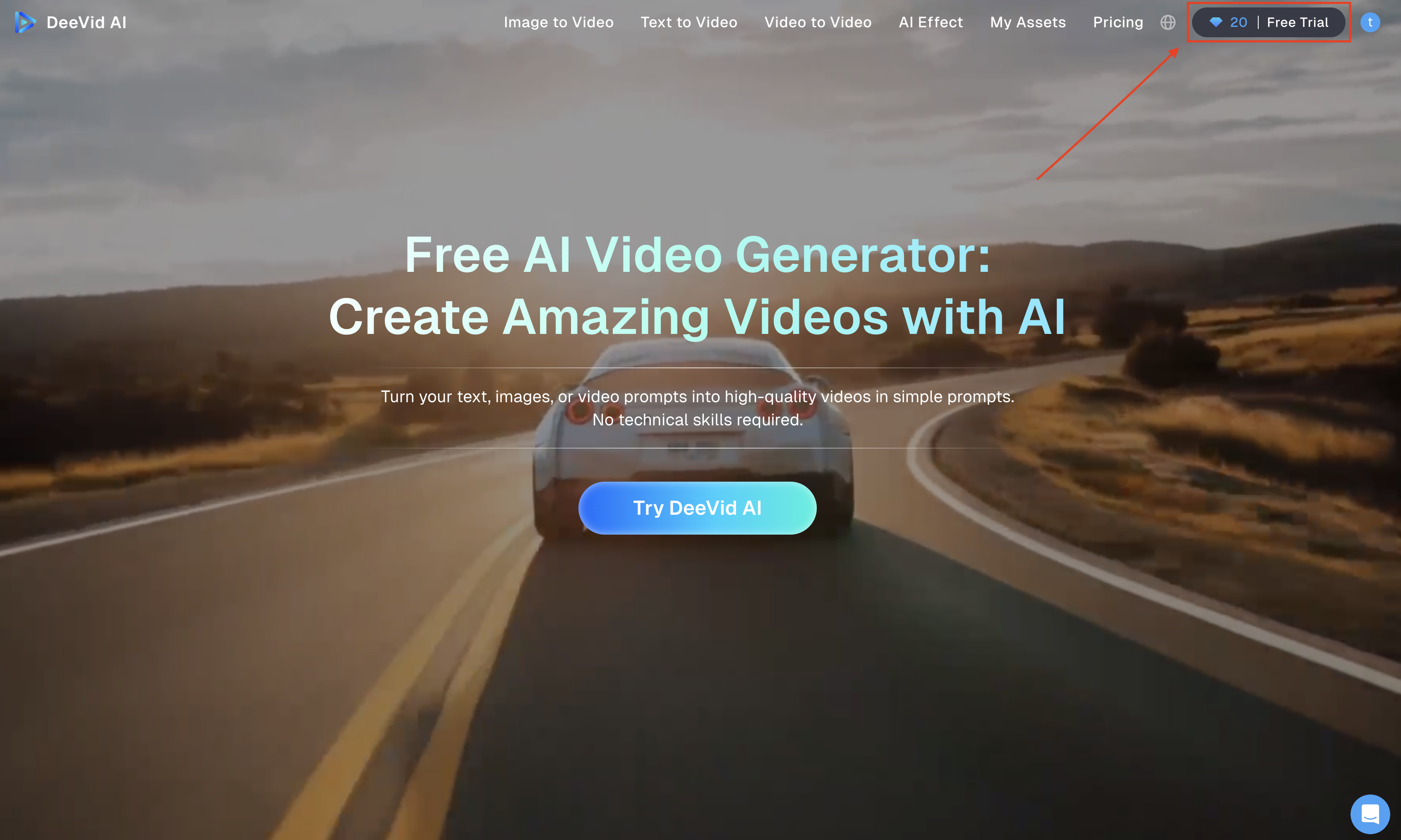 Войдите в аккаунт DeeVid.ai. В правом верхнем углу нажмите кнопку Free Trial или сразу откройте раздел Pricing в меню.