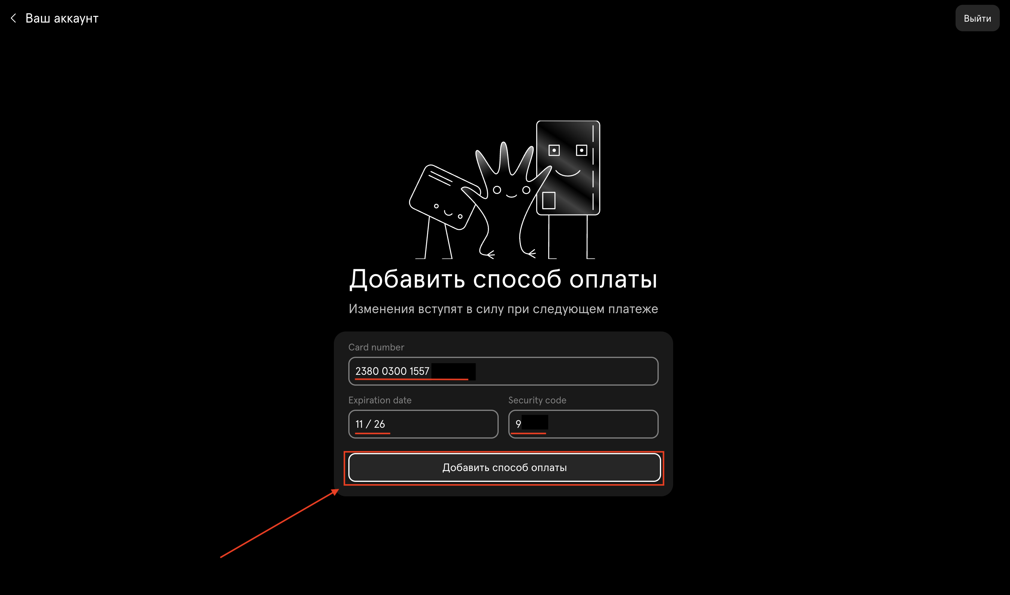 После ввода данных нажмите Добавить способ оплаты.