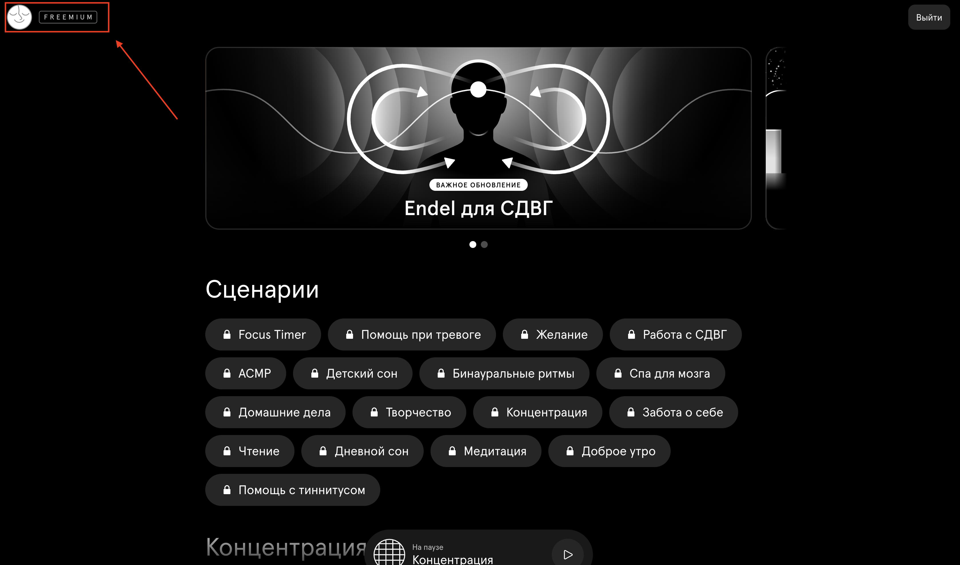 После входа в Endel в левом верхнем углу нажмите на значок профиля, где отображается статус Freemium.