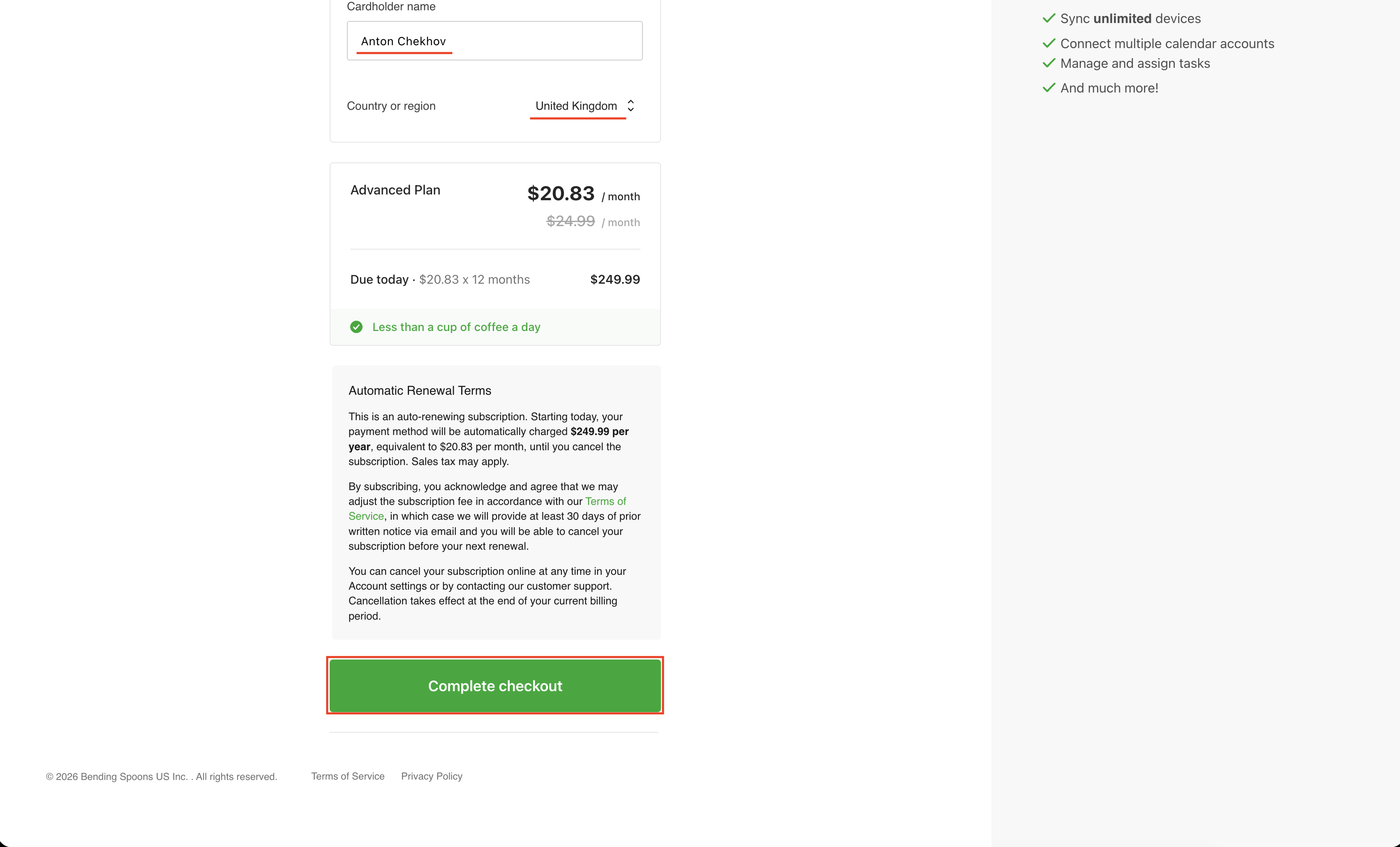 После заполнения формы нажмите Complete checkout.
