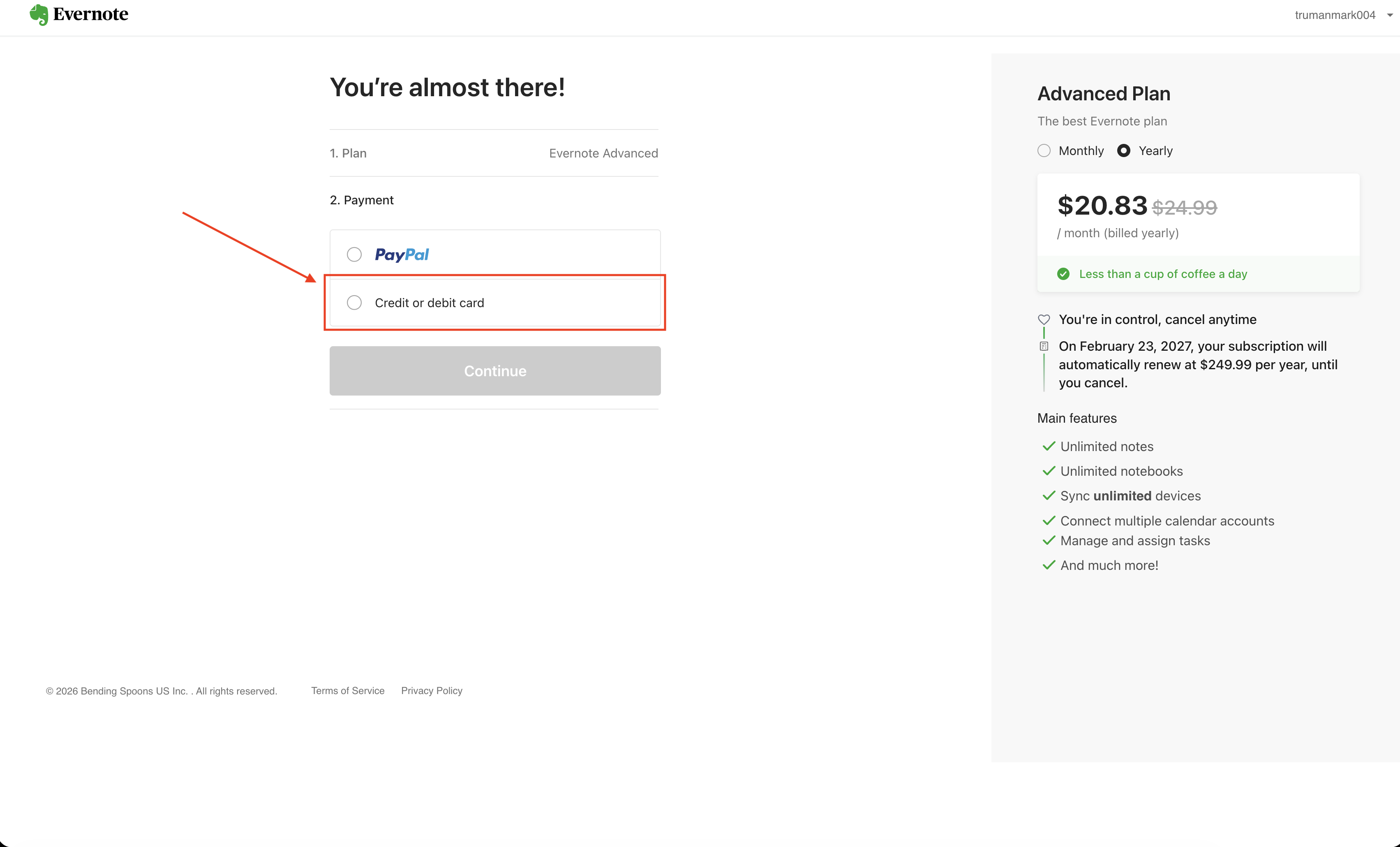 Ниже пошаговый порядок оплаты на основе актуального интерфейса Evernote.