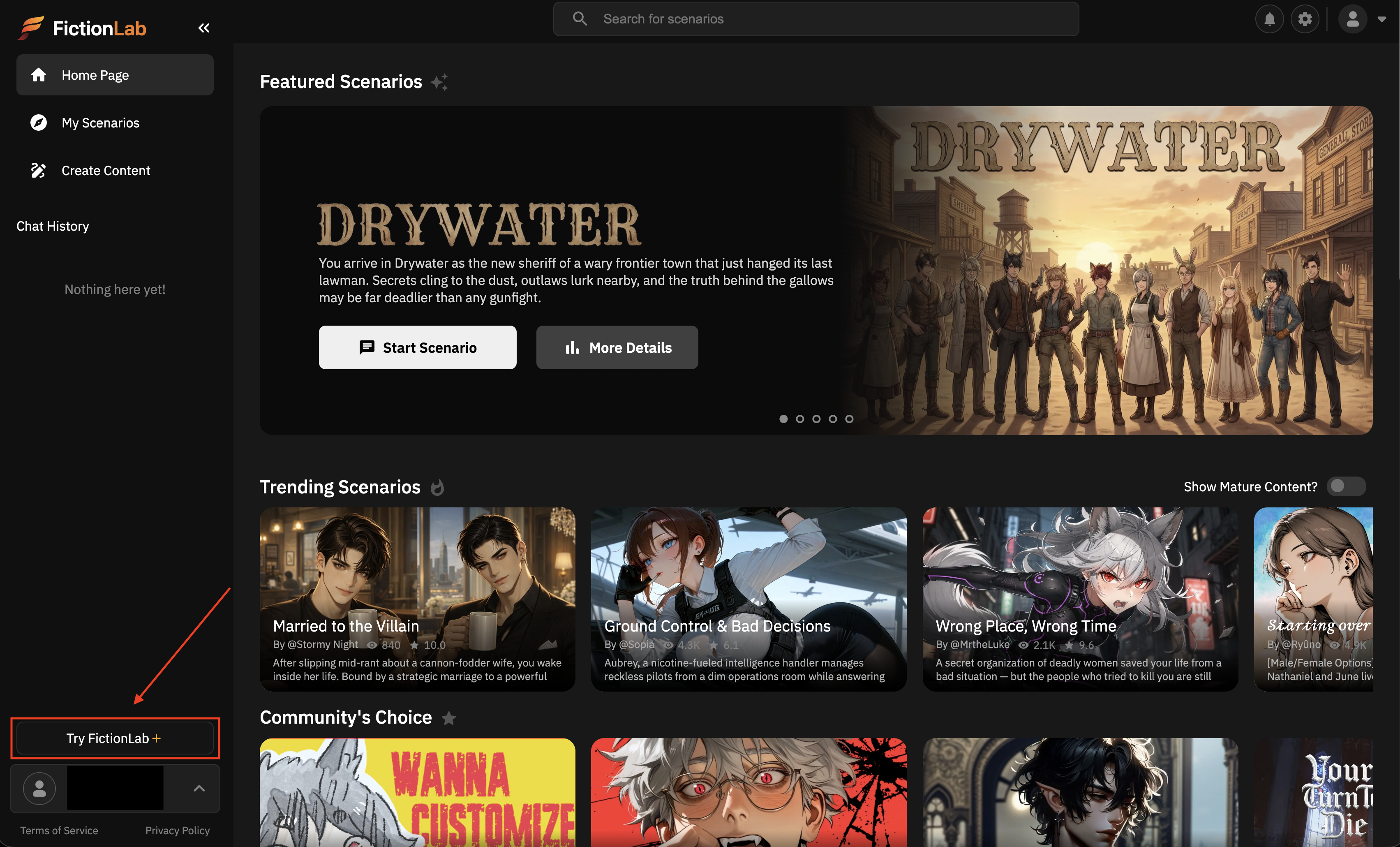 После входа в аккаунт нажмите кнопку Try FictionLab+ в левом нижнем углу интерфейса.