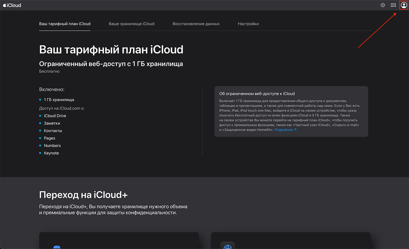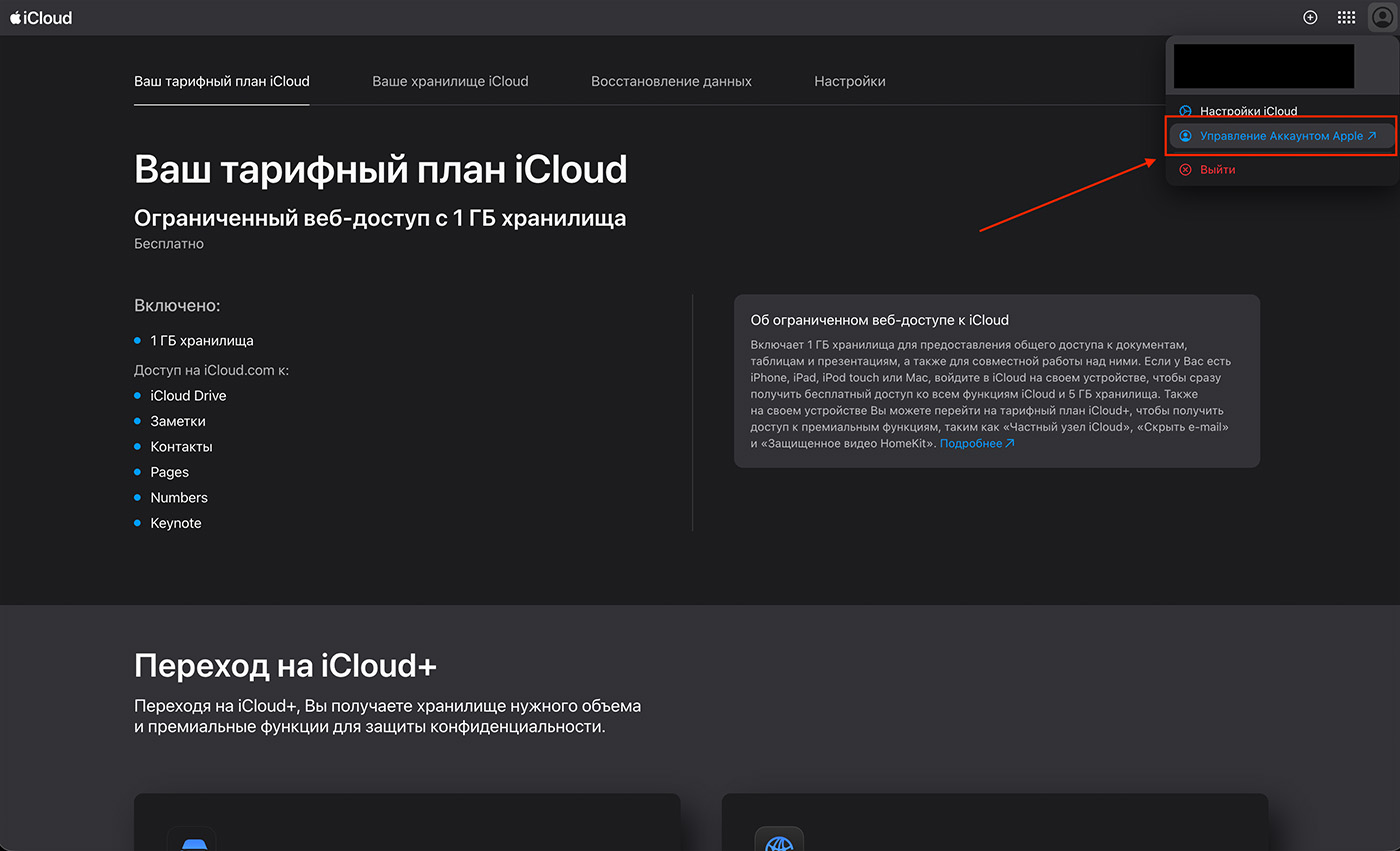 В разделе Ваш тарифный план iCloud выберите переход на iCloud+.