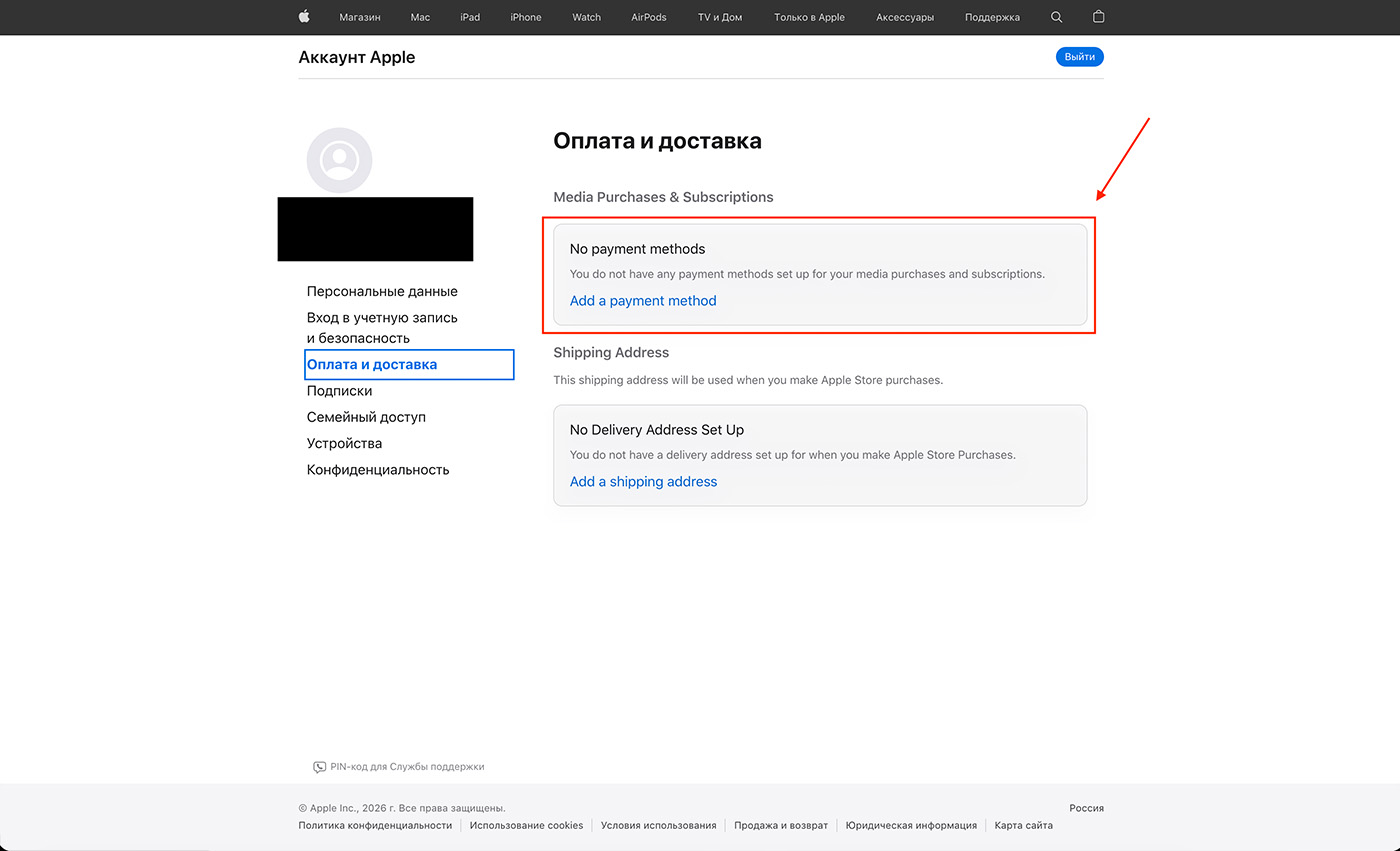 В блоке Media Purchases & Subscriptions нажмите Add a payment method.