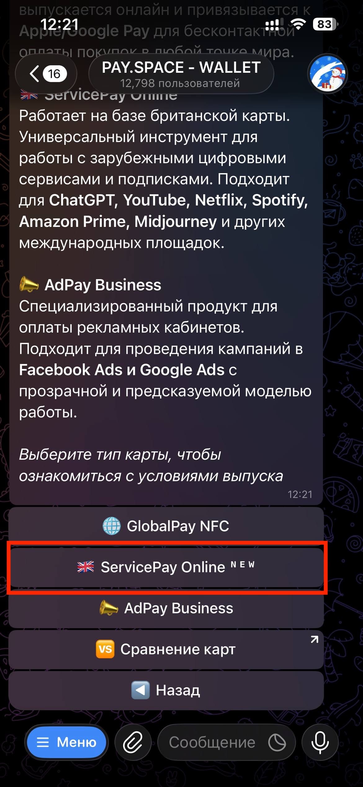 Как создать виртуальную карту Service Pay от PAY.SPACE