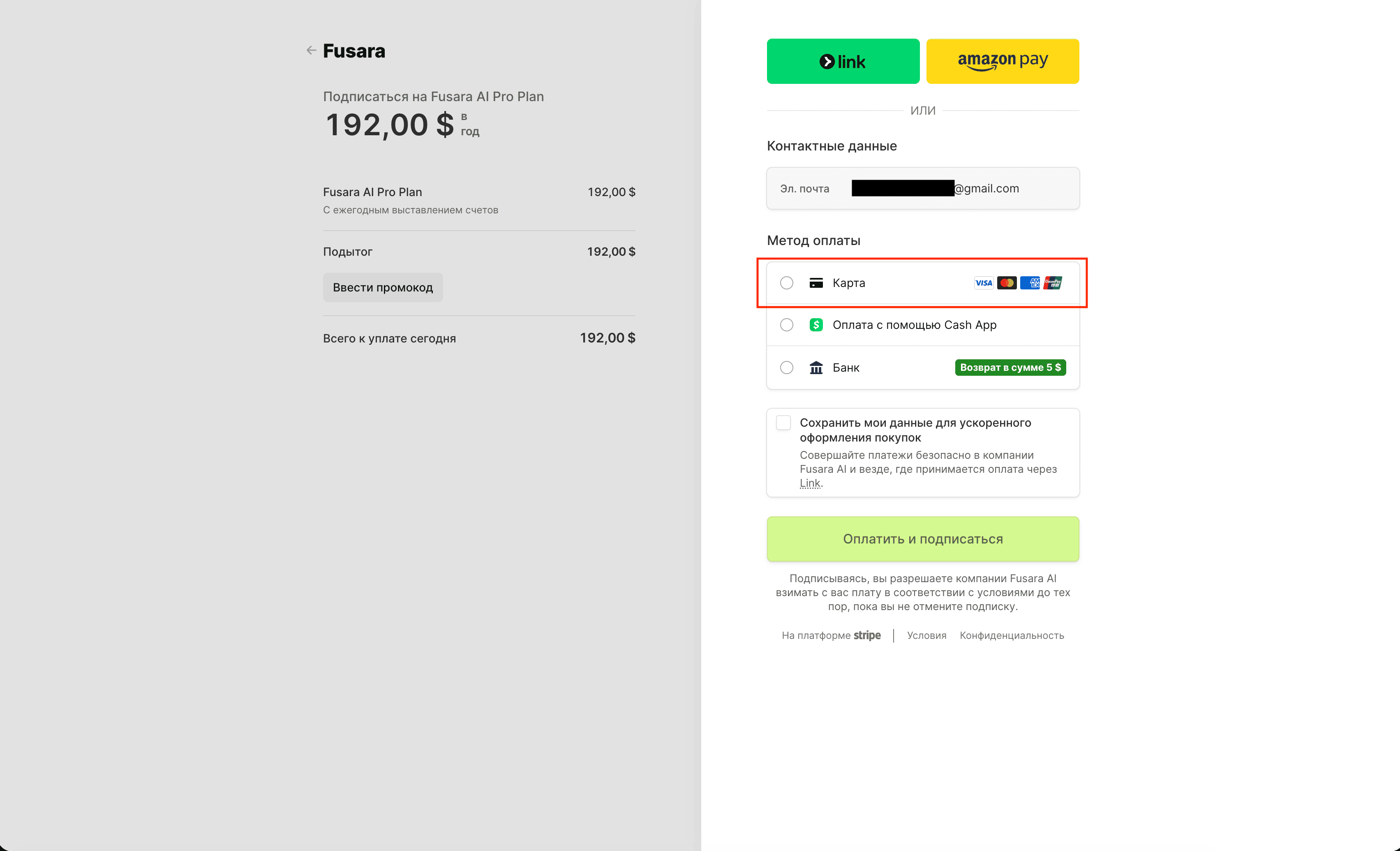 После выбора тарифа откроется платежная страница. В ней будет указана стоимость подписки.