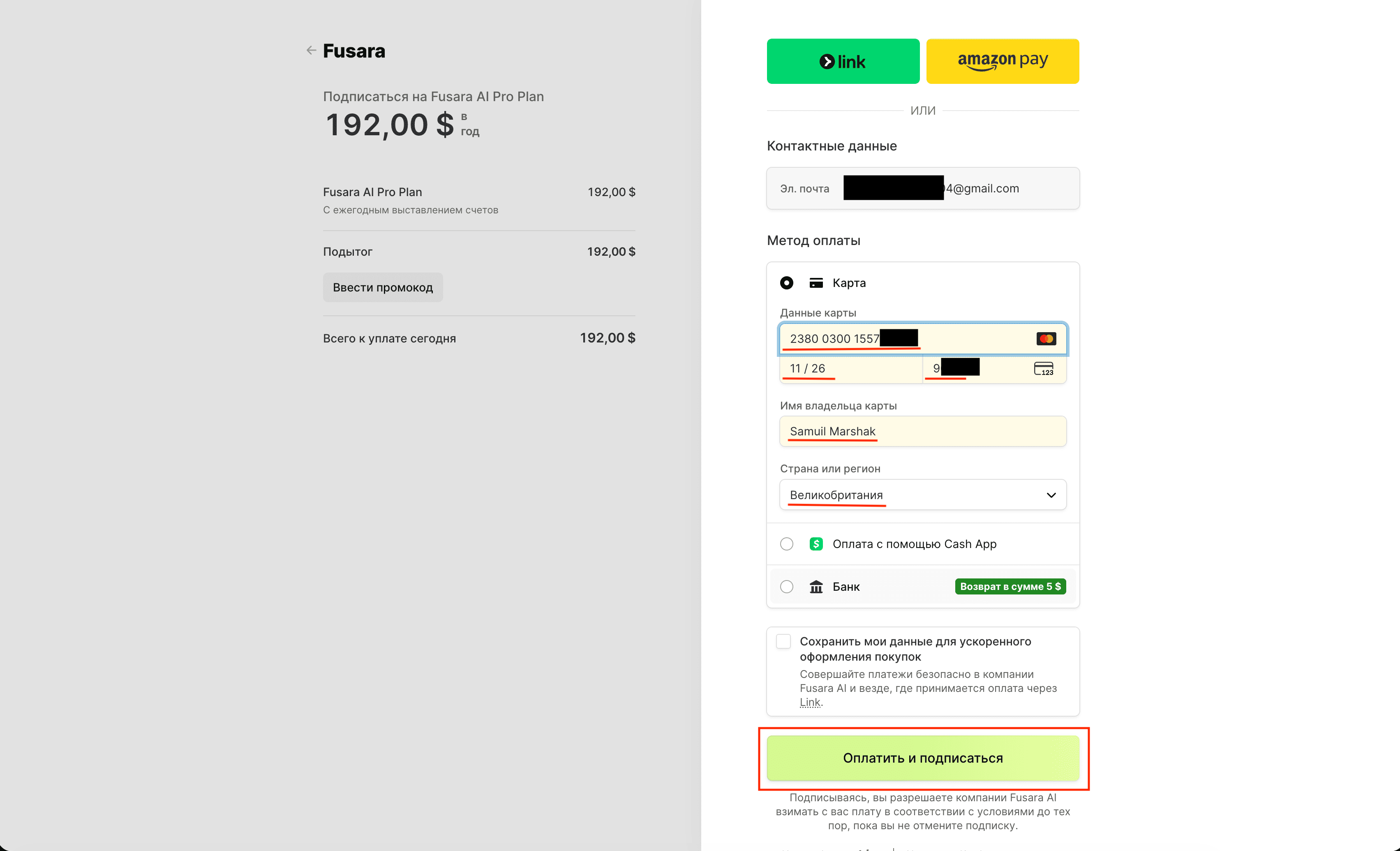 После ввода данных нажмите кнопку Оплатить и подписаться (Pay and Subscribe).